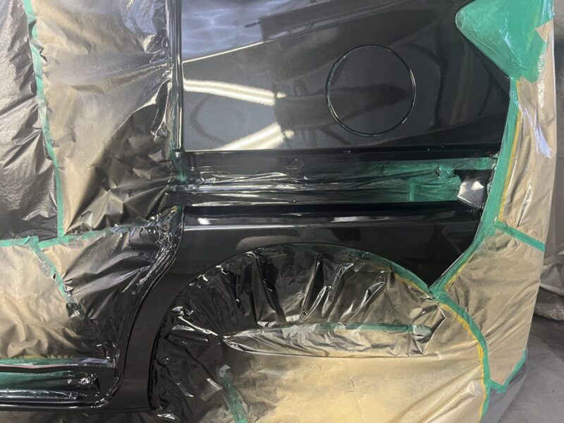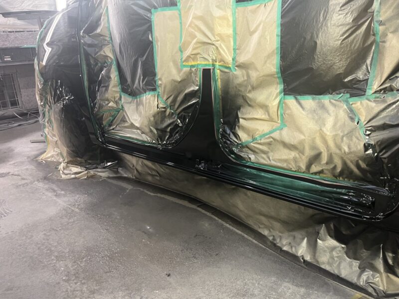 板金で形を復元した箇所に、極薄くパテを塗って表面を滑らかに研磨します。その後、塗料の密着性を高めサビを防ぐ「サフェーサー」を塗布。塗装しない部分に塗料が飛ばないよう、車体全体を専用のシートで厳重に覆い(マスキング)、塗装ブースへと移動させます。