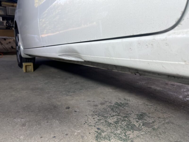 縁石への乗り上げで深く凹んだ左ロッカーパネルを、切断交換せず高度な引き出し板金にて修復いたしました。車両保険を適用し、スライドドアとの隙間調整や入念な防錆処理まで行うことで、強度と美しさを完全に復元しております。