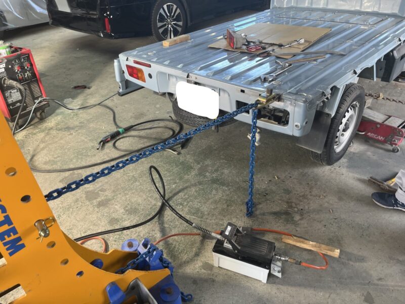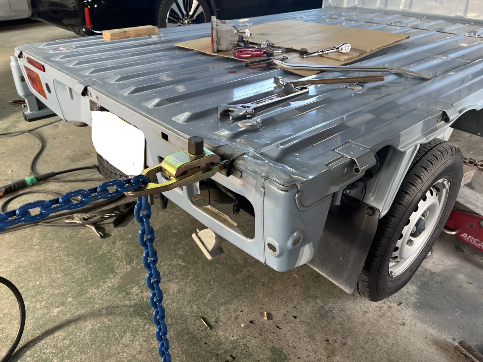 軽トラックの修理で最も大切なのは、アオリがストレスなく開閉し、荷台としての強度を完全に復元することです。追突事故では一見大丈夫そうに見えても、内側の骨格が歪んでいることが多いため、バンパーやパネルを取り外して徹底的に内部を修正いたしました。