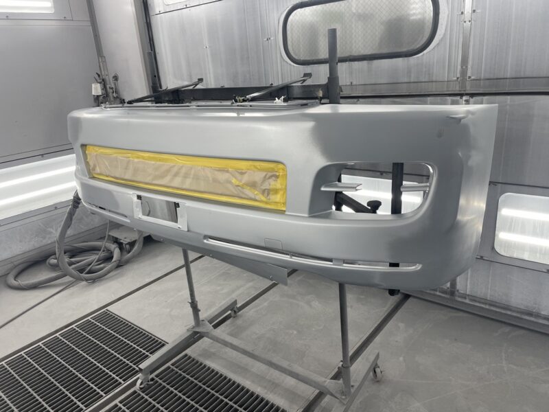 ハイエースの大きなバンパーは、交換すると部品代だけでかなりの高額になります。自費修理において一番の節約術は、パーツを再利用する「板金塗装」です。ティーズオートサービスでは、熱を加えて変形を戻し、緻密なパテ成形と塗装を行うことで、交換せずとも「どこに傷があったか分からない」レベルまで復元します。