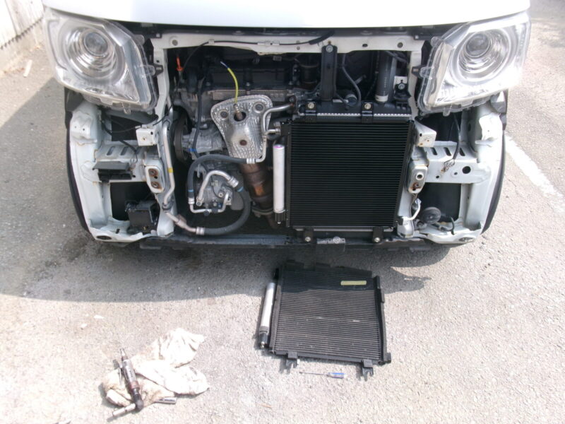 フロントバンパーに大きなヘコミとキズがあり、内部ブラケットやライト周辺にも衝撃が加わっていました。